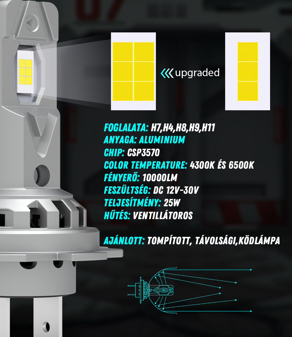 Fényerő 8000 Lumen Fogyasztás 25 Watt Rendszer 12-24 Volt Színhőmérséklet 6500K hideg fehér- Hideg fehér fényű