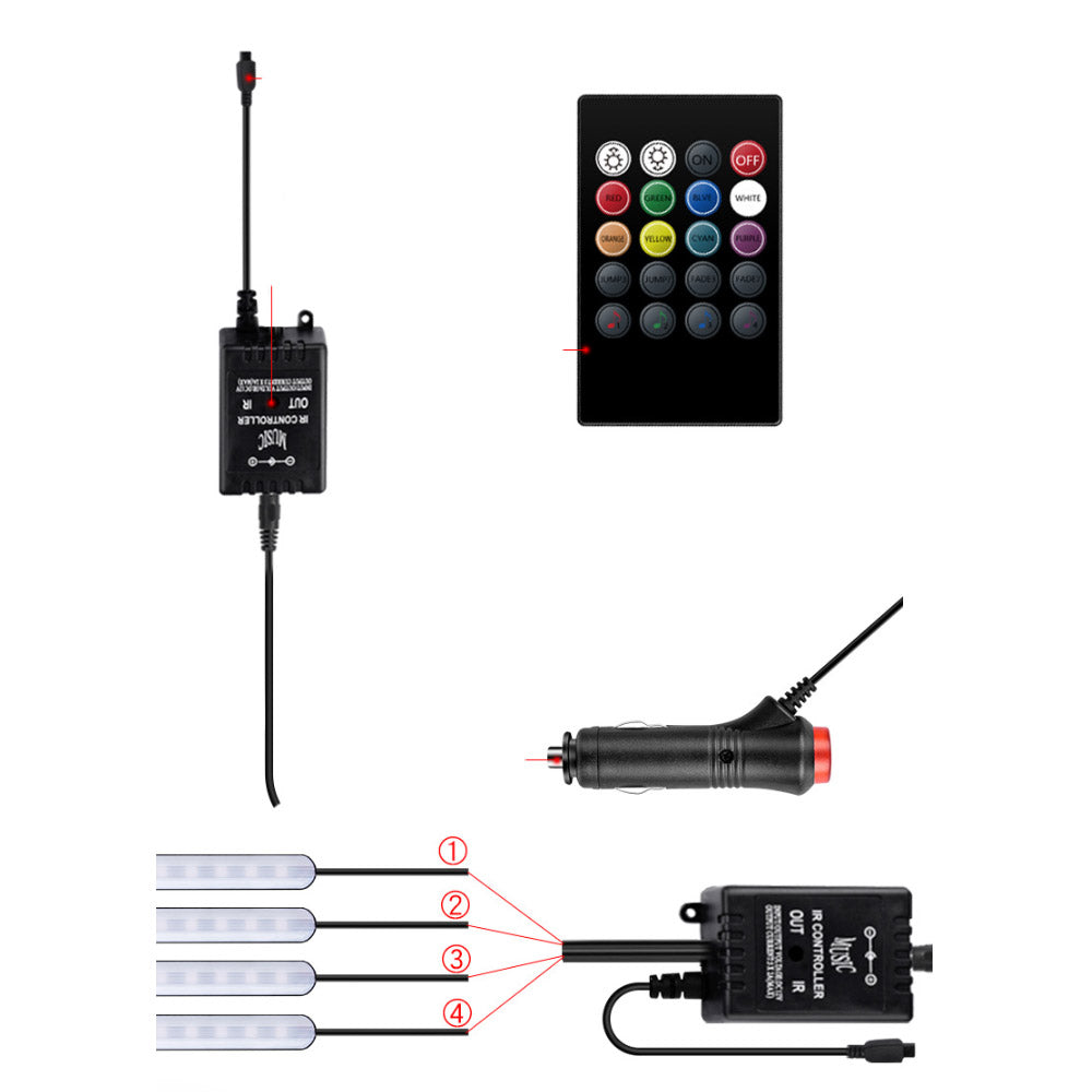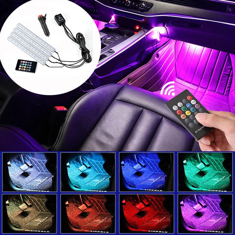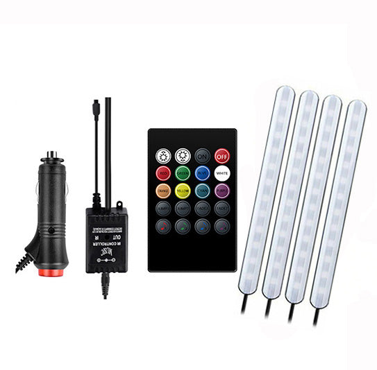 Ha szeretnél egy új dizájnt adni az autód belterének, akkor a ledes autó lábtér világítás szett a tökéletes választás! A lábtér világítást a szivargyújtóba lehet csatlakoztatni, és lehetővé teszi, hogy a belső térben egyedülálló hangulatot teremts. A világítás funkciók között többféle színválasztás és fényprogram is szerepel, amelyek segítségével az autó utastere egészen új megjelenést kaphat. A szett távirányítóval vezérelhető, így könnyedén állíthatod az árnyalatot és az intenzitást az autóban való kényelmes utazáshoz. Az RGB ledek teljes színskálája beállítható, piros kék fehér zöld sárga lila stb stb Bekötés, felszerelés: A beszerelése nagyon egyszerű,a led szett pár perc alatt telepíthető bármelyik autóba. Az áram ellátása szivargyujtóról történik, így semmilyen plusz bekötést nem igényel. A ledek kétoldalú ragasztóval rakhatóak fel a műszerfal illetve az ülések aljára. A kábelezése úgy van kialakítva, hogy a hátsó ülések alá is belehessen tenni a ledeket így egységes fényt ad az autó belterébe. A kábeleket az autó kárpitjába ellehet rejteni, szétszerelés nélkül is könnyen becsúsztatható a kárpit elemek közé. Működése: A szivargyujtós csatlatkozó tetején kapcsolóval van ellátva, egy gombnyomással ki-bekapcsolható a távirányító használata nélkül is. A távirányítóval az alapszíneken kívül különböző zene ütemére reagáló programok is beállíthatóak A led szettnek a fényereje állítható az egészen halványtól a teljes fényerőig. A ledek mivel lefele néznek, a teljes fényerő sem zavaró, nem vakítja a sofőrt vagy az utasokat