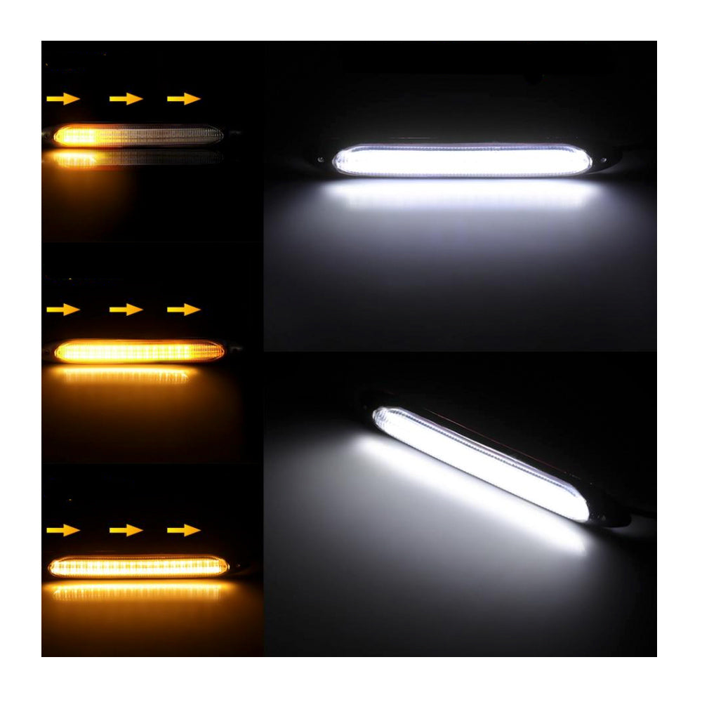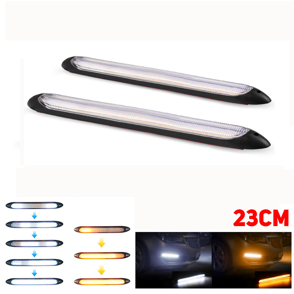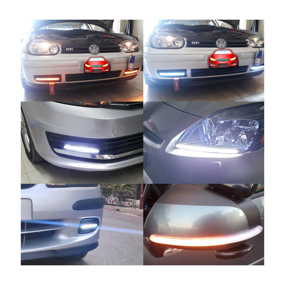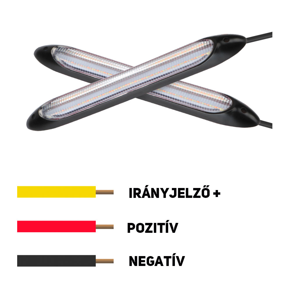 DRL ledes nappali menetfény szett, hideg fehér fénnyel és bekapcsoláskor üdvözlő fénnyel, illetve narancssárga index funkcióval rendelkezik. Az index funkció a mai autókhoz hasonlóan futófénnyel világit, ez a képek közt illusztrálva van. Az üdvözlőfény bekapcsoláskor végig fut a led teljes hosszán majd szakaszokban világítva áll be a menetfény. A ledcsík könnyen felszerelhető, alakítható öntapadós hátlappal van ellátva és teljesen vízálló szilikonbukolatba van építve Az index funkció müködéséért felelős vezérlő egység már bele van építve Amikor indexel, akkor nem világít fehéren, ezt automatikusan váltja Mérete: 23cm hosszú, és 2cm széles.. Amennyiben automatikus ki/be kapcsolással szeretné használni, akkor érdemes menetfény vezérlő elektronikával bekötni. Menetfény adatai: Rendszer: 12V Fogyasztás: 20 Watt Fényerő: 1300 Lumen E jellel nem rendelkezik A termékről bemutató videó is megtekinthető Youtube csatornánkon! https://youtu.be/ei1EOmQQGDc Üdvözlőfény és futófényes irányjelző Az üdvözlőfény bekapcsoláskor végig fut a led teljes hosszán majd szakaszokban világítva áll be a menetfény. Az irányjelző futófénnyel világít.